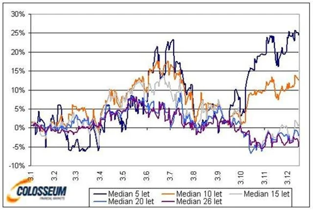 Odlišná situace ovšem nastává na konci roku, kde dlouhodobé mediány nepotvrzují prudký růst. Z grafů je zřejmé, že prudkých růstů ke konci roku jsme byli svědky až v posledních letech.