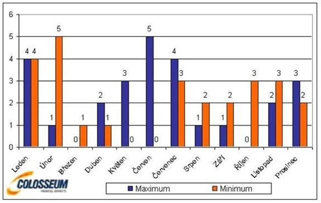 Obrázek 4: Množství ročních maxim a minim v jednotlivých měsících za 26 let (Zdroj: CSI, Colosseum)