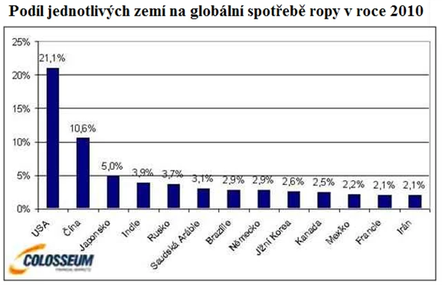 Na prvním grafu je znázorněn podíl jednotlivých zemí na globální spotřebě ropy v roce 2010. Aktuální statistiky BP uvádějí globální spotřebu ropy v minulém roce na úrovni 87,38 milionu barelů denně.