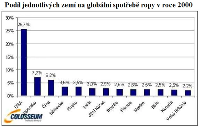 Z obrázku je zřejmé, že jednoznačně největší podíl mají Spojené státy (21,1 %). Na druhém místě je Čína (10,6 %) a na třetím Japonsko (5 %). Ze 13 největších spotřebitelů spadá 7 zemí do kategorie rozvíjejících se trhů. Ještě v roce 2000 to bylo pouhých 5 zemí. Ze srovnání s rokem 2000 dále vyplývá, že podíl Spojených států na spotřebě klesá.