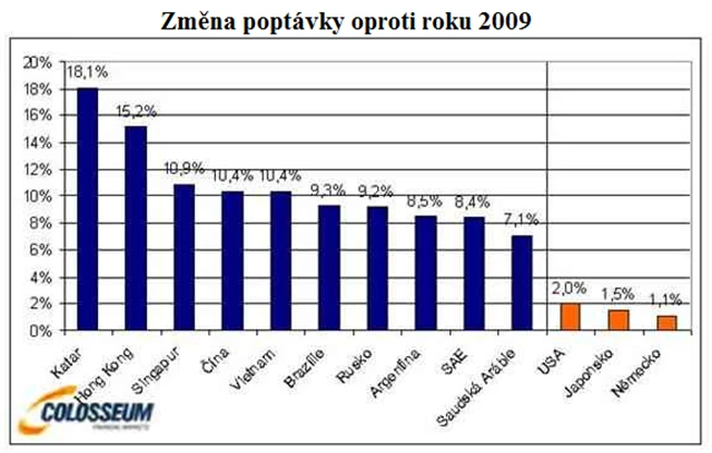 Význam emerging markets neustále roste. Potvrzuje to i další obrázek, na kterém je znázorněna změna poptávky oproti roku 2009. Globální poptávka se meziročně zvýšila o 3,1 % (+2,67 mil. barelů denně) na 87,38 milionu barelů denně. Z údajů je zřejmé, že největší růst poptávky zažívají rozvíjející se ekonomiky.