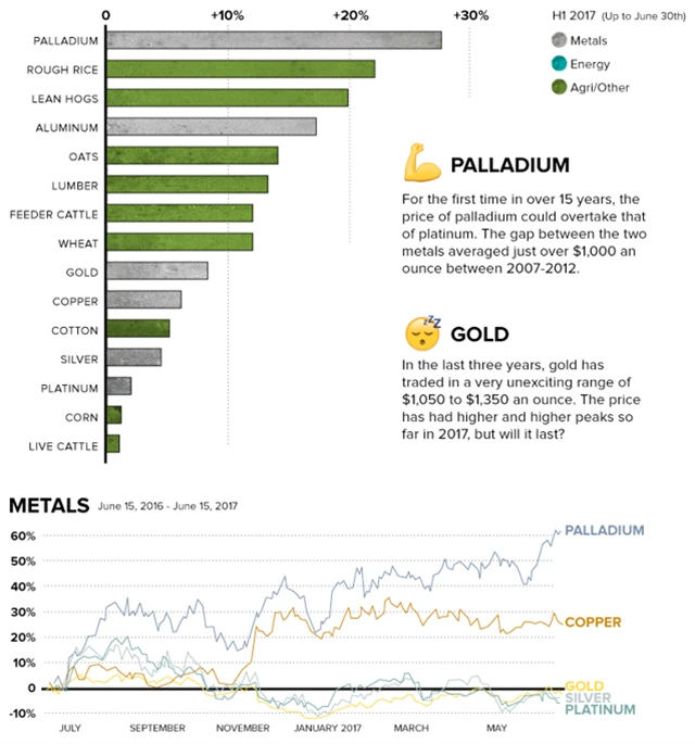 Vítězem letošního prvního pololetí je na komoditních trzích paládium, které zdražilo o bezmála 30 %. Druhou příčku obsadila rýže a na třetím místě skončilo vepřové maso. V plusu jsou od začátku roku i zlato, stříbro nebo měď, jejich cenové přírůstky jsou ale jen mírné.