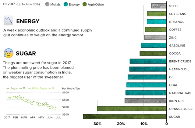Slabý půlrok za sebou má naopak cukr, jehož cena spadla o třetinu. Mezi dalšími poraženými jsou pomerančový koncentrát, železná ruda, zemní plyn, uhlí nebo ropa.