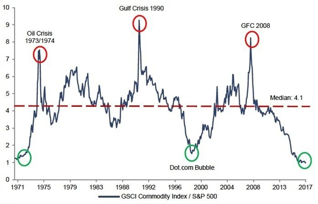 Nesourodý vývoj cen amerických akcií a komodit je nejlépe patrný při srovnání komoditního indexu banky Goldman Sachs s indexem S&P 500. Jinými slovy, komodity jsou nyní ve srovnání s americkými akciemi nejlevnější za 45 let.
