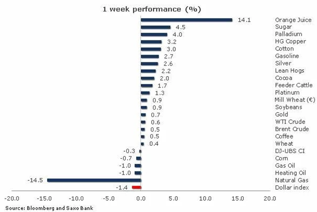 Index S&P GSCI, kde mají velkou váhu energetické komodity, přidal za uplynulý měsíc zdravá 2 %. Širší index DJ-UBS zatím přidal pouze 0,3 %, přičemž silné zisky v sektoru kovů byly vyváženy ztrátami na obilninách. Část zisků vzal slabší dolar, na kterém investoři realizovali po rekordně velkých dlouhých pozicích zisky, zejména proti euru.