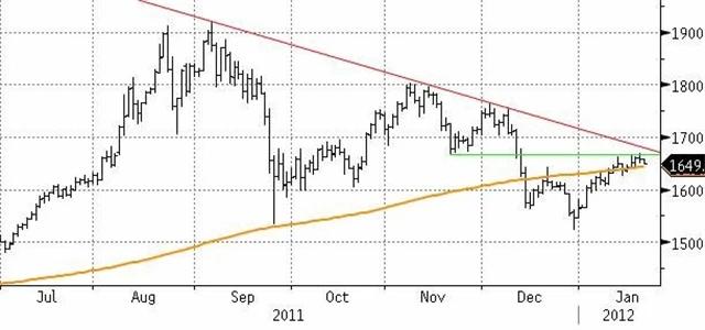 Technicky čeká zlato rezistence na 1 670 dolarech, což je zároveň dno přecházejícího obchodního pásma a trendová linie od zářijových maxim. Podporu tvoří 200denní klouzavý průměr na hodnotě 1 642 a meta 1 600 dolarů.