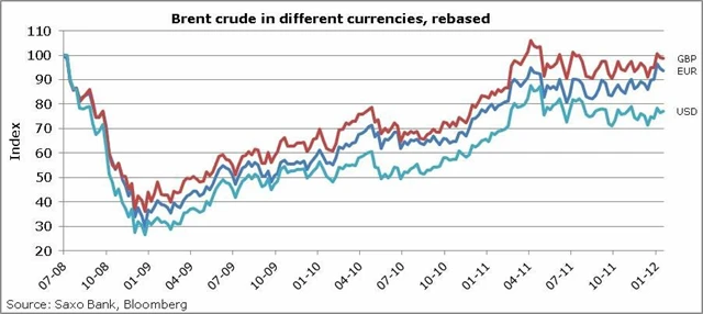 Ačkoli je současná cena ropy Brent dostatečně vzdálena od svého maxima z roku 2008, v jiných měnách dostaneme odlišný obrázek, což pomůže objasnit negativní dopad na ekonomický růst, který zažíváme.