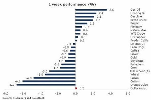 Komodity se v uplynulém týdnu vyvíjely smíšeně. Energiím se díky extrémně chladnému počasí v Evropě a díky lepšímu ekonomickému výhledu dařilo. Naopak zemědělské komodity zažily mírné prodeje. Index DJ-UBS, který zahrnuje 20 hlavních komodit, oslabil v minulém týdnu o 0,3 % a od začátku roku je výše o 3,2 %.