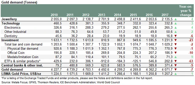 Celosvětová poptávka po zlatě v loňském roce klesla o sedm procent na 4 071,7 tuny, a byla tak nejnižší za osm let. Důvodem byl propad poptávky po investičním kovu. Poptávka po zlatých špercích naopak poprvé od roku 2013 stoupla.