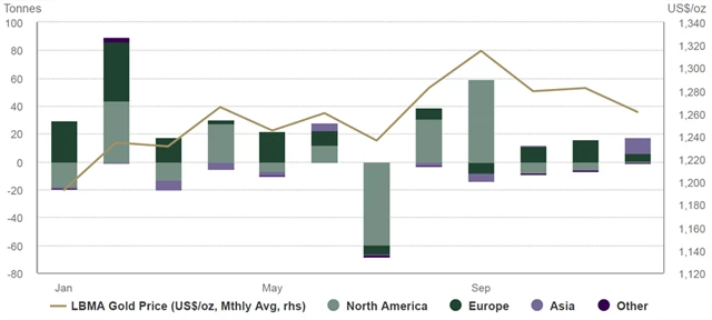 Poptávka po investičním zlatě se loni snížila o 23 %. Zájem o investování do žlutého kovu oslabilo několik faktorů, zejména růst jeho ceny, oslabení dolaru, růst úrokových sazeb a pokračující akciová rally. Poptávka po burzovně obchodovaných fondech investujících do zlata spadla o 63 % na 202,8 tuny, poptávka po zlatých slitcích a mincích se snížila o dvě procenta na 1 029,2 tuny. Do evropských ETF loni přitekly prostředky, jež byly ekvivalentem 148,9 tuny zlata, do amerických fondů investoři poslali prostředky v ekvivalentu 63 tun kovu.