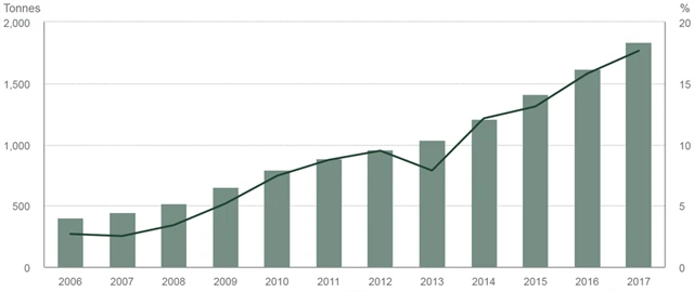 Poptávka po zlatě v technologickém sektoru (2010-2017), zdroj: WGC