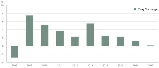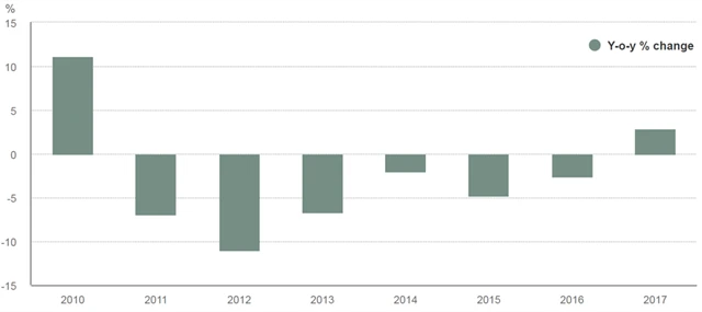 Vývoj těžby zlata (2008-2017), zdroj: WGC