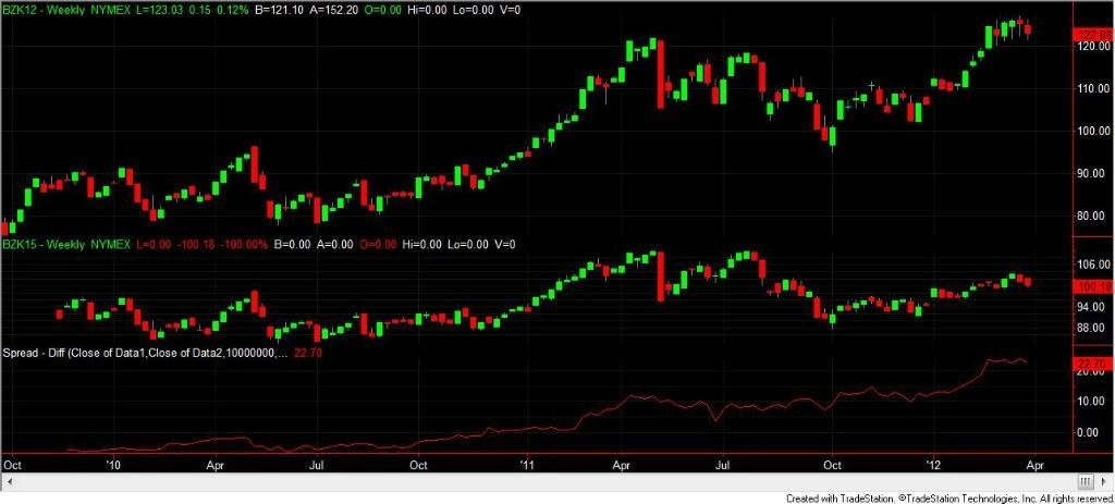 Zkušení investoři a obchodníci se dívají nejen na současné ceny kontraktů, ale také na takzvané forwardové křivky, tedy na ceny kontraktů s dodávkou za několik měsíců nebo let. Zajímavostí je, že se u ropy dostal spread mezi současným kontraktem a cenou dodávek v horizontu 3 až 5 let, na historiké maximum (při současném nejbližším kontraktu WTI na hodnotě okolo 103 USD za barel).