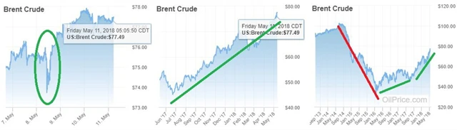 Saúdská Arábie uvedla, že je ochotna zmírnit dopad nedostatku dodávek ropy v Evropě způsobeného novými sankcemi. "Pokud jde o ceny ropy, podle mě se velká část posledních událostí již odráží ve spotové ceně. Ve středu 9. května, po oznámení sankcí, vzrostla cena ropy Brent o dolar na 77 USD za barel. V té době barel zdražil o zhruba 10 USD za 4 týdny. Většina expertů odstoupení USA od dohody očekávala," říká Robinson.