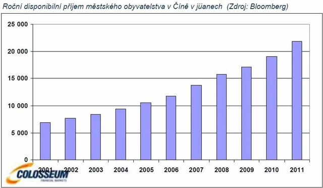 Bohatství Číňanů nadále prudce roste. Tamní statistický úřad uvedl, že průměrný roční disponibilní příjem městského obyvatelstva vzrostl v roce 2011 o 14 % na 21 810 jüanů (3 460 USD), příjem venkovanů se zvýšil až o 18 % na 6 980 jüanů (1107 USD).
