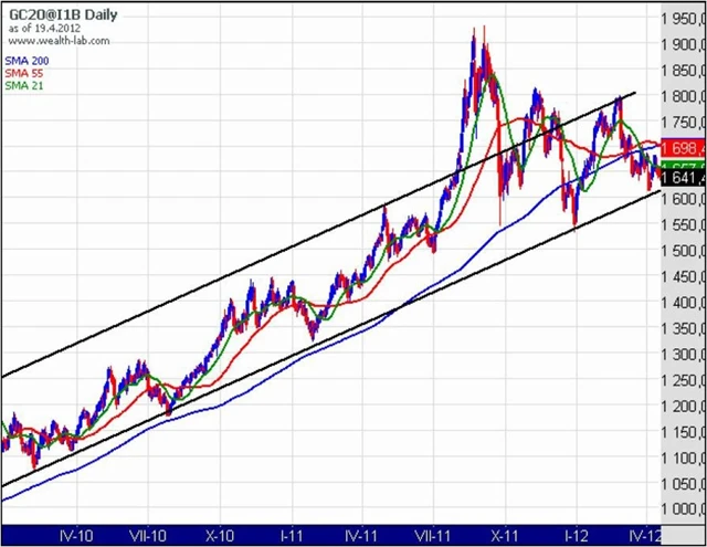 Cena zlata se už dva roky pohybuje v dlouhodobém růstovém trendu, který je možné znázornit vzestupným kanálem. Na konci roku 2011 a počátkem dubna 2012 nastalo odražení od jeho spodního okraje. Dlouhodobý vzestupný trend je stále zachován, což nám ukazuje 200denní (modrá křivka) klouzavý průměr. Na úrovni 1 600 dolarů se nachází silný support.