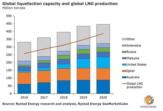 Očekává se, že celosvětová produkce LNG se v letošním roce zvýší o 11 % a dosáhne 350 milionů tun ročně. Stojí za tím nové kapacity pro zkapalňování, což zajistí nárůst objemu zkapalněného plynu o 10 % oproti roku 2018 na celkových 434 milionů tun. Zejména v USA dojde téměř ke zdvojnásobení produkce ve zkapalňování, a země se tak stane světovou trojkou. Austrálie předběhne Katar a stane se jedničkou.