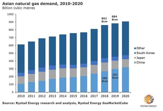 Celková poptávka po zemním plynu v Asii vzroste letos podle předpokladů na 884 miliard kubických metrů. Největším odběratelem je Čína, jejíž importy jako největšího světového dovozce porostou o 21 %. Poptávka ostatních zemí jihovýchodní Asie je citlivější na cenu, takže zlevnění může vést k větší spotřebě. Kompenzaci ale může představovat pokles poptávky ze strany Japonska a Jižní Koreje kvůli mírnějšímu počasí a obnově výroby energie z jádra.