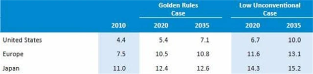 Důsledky těchto "pravidel" pro energetický trh si lze demonstrovat na následujících prognózách. V první tabulce vidíme, že pokud by se těžilo podle stávajících standardů, tak by cena plynu do roku 2035 vzrostla v USA na 10 USD za MBtu. Za předpokladu využití "zlatých pravidel" by cena mohla být až o 30 % nižší. Tabulka zobrazuje velkoobchodní ceny nezahrnující daň.