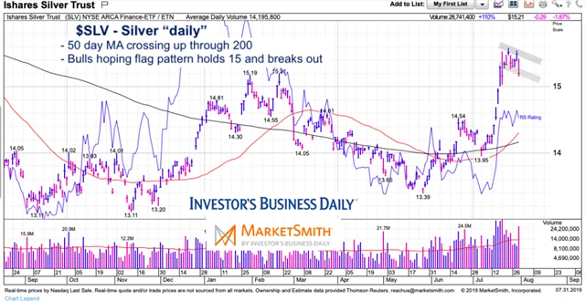 Při pohledu na denní graf ceny stříbra je tento trend patrný. To, že 50denní klouzavý průměr překonal ten 200denní, ještě také není záruka silného a dlouhotrvajícího trendu, ale pokud se kurzu podaří vytvořit na grafu formaci vlajky a prorazit horní hranu rezistence, růst ceny stříbra může pokračovat.
