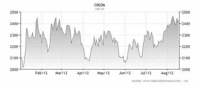 Prosincový kontrakt na dodávku kakaa v úterý na Intercontinental Exchange zdražil na 2 430 USD za tunu. Důvodem jsou informace o nedostatku dešťových srážek v Pobřeží slonoviny a Ghaně. Na trhu panují obavy, že klimatický jev El Niño bude dále mít za důsledek suché počasí, což by ohrozilo předpokládanou produkci. Cena kakaa vzrostla za uplynulý měsíc o 9 %.