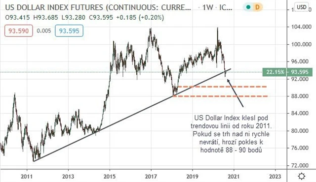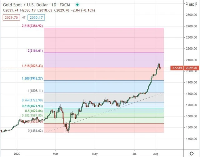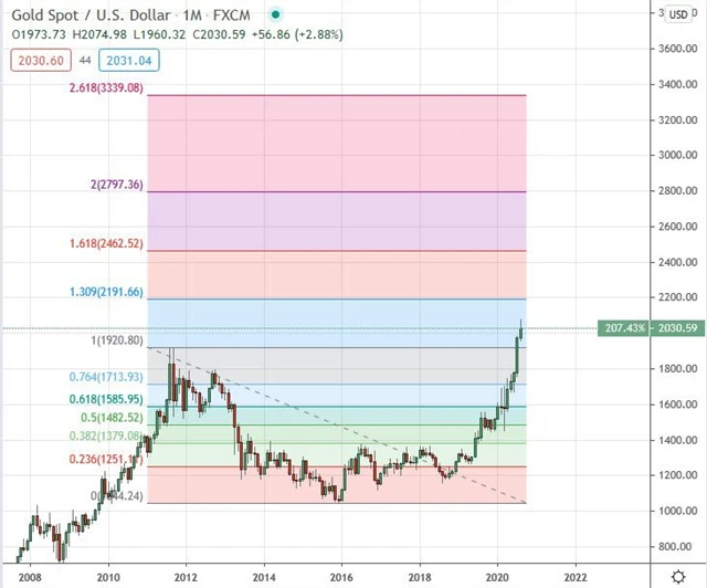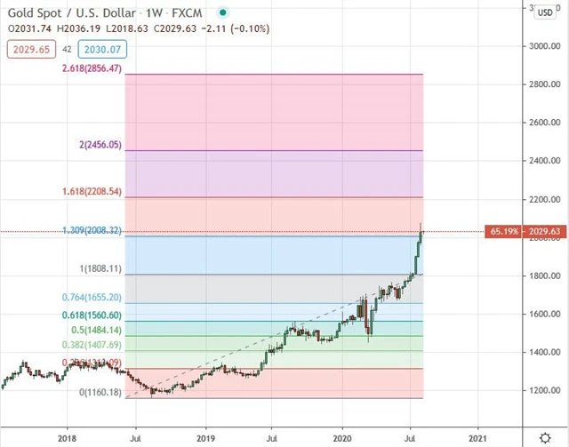 Jelikož se zlato obchoduje v dolarech prakticky na historickém maximu, nemá nad sebou žádné rezistence z minulosti. Pokud bychom aplikovali metodu Fibonacciho retracementu (FR) a jeho další projekce ceny, vychází následující technické úrovně: