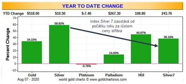 Akcie těžařů stříbra (index Silver 7) dokonce zaostávají od začátku roku za růstem ceny této komodity. To bylo v minulosti většinou předzvěstí korekce cen kovů, pokud nezačnou akcie těžařů růst cen zlata i stříbra významněji předhánět v nejbližší době.