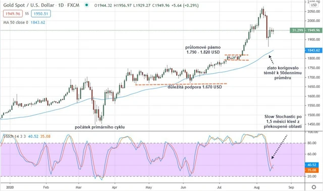 Od poloviny března neprodělal trh se zlatem významnější korekcí. 21. července navíc došlo k významnému prolomení ceny nad 1 800 USD za trojskou unci. Růst kurzu byl v té době doslova vertikální. Primární cyklus se začal protahovat nad svou průměrnou délku a většina technických indikátorů naznačovala silnou překoupenost.