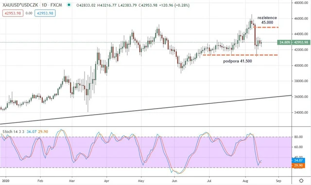 Ani zlato v českých korunách nebylo ušetřeno prudkého cenového propadu. Kurz spadl z maxima ze 7. srpna o více než 5 000 Kč na unci. Trh se nyní stabilizuje okolo hladiny 43 000 Kč za unci, přičemž nejbližší podpora je na 41 500 Kč a rezistence u 45 000 Kč za trojskou unci.