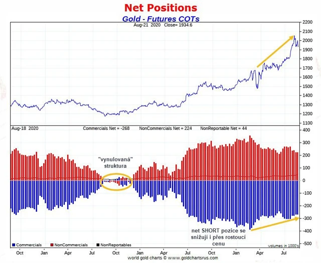 Od počátku letošního roku se ovšem ukazuje jiná nezvyklá divergence. V únoru kulminoval počet "net SHORT" pozic komerčních obchodníků u necelých 400 000 kontraktů, což byl historický rekord. Obecný konsenzus byl do té doby takový, že s růstem ceny se zvyšují i "net SHORT" pozice komerčních obchodníků (a s poklesem ceny se snižují). Od poloviny března ale dochází k tomu, že se "net SHORT" pozice komerčních obchodníků postupně snižují i přes rostoucí cenu zlata, což je nevídaný fenomén a poměrně býčí faktor ze střednědobého hlediska.