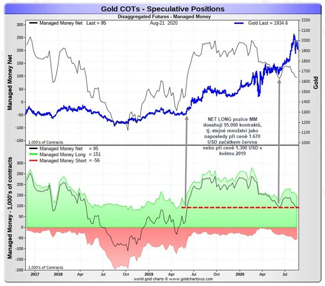 Tato skutečnost signalizuje, že trh se zlatem není ani zdaleka přehřátý nebo ve fázi spekulativní bubliny, jelikož nekomerční obchodníci nejsou exponováni na svých kontraktních maximech a (hlavně) jejich podkategorie "managed money" drží z historického hlediska spíše podprůměrné "net LONG" pozice.