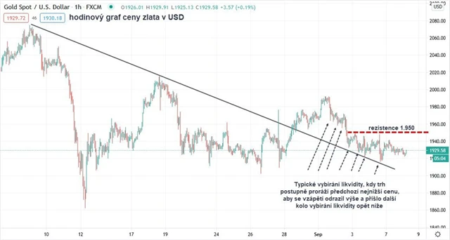 Opět se potvrdilo, že jakmile zlato propadne na spotovém trhu pod 1 950 USD za unci, není následně schopno se nad tuto úroveň vrátit. Během týdne tvořila tato hodnota silnou rezistenci (význam této ceny jsem rozebíral před dvěma týdny).