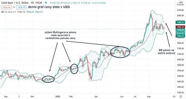 Od 12. srpna, kdy kulminoval prudký čtyřdenní výprodej, probíhá na trhu se zlatem zklidnění cenového vývoje. To naznačuje i Bollingerovo pásmo, které vizualizuje volatilitu aktiva. Pásmo se na denním grafu podstatně zúžilo, což často indikuje blížící se vertikální vývoj. Aktuálně činí jeho rozpětí 90 bodů, takže je stále prostor pro další zúžení (uklidnění trhu)- To by indikovalo, že se cena unce zlata ještě může nějakou dobu pohybovat v pásmu 1 900 až 1 990 USD, než se rozhodným způsobem vydá jedním ze směrů. 7. srpna, kdy cena vzrostla ke 2 075 USD, dosahovalo rozpětí Bollingerova pásma 369 bodů.
