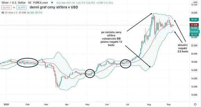 Na trhu se stříbrem probíhá podobné uklidňování jako na trhu se zlatem. Cena stříbra se konsoliduje pod silnou rezistencí 30 USD za trojskou unci. Také na tomto trhu se Bollingerovo pásmo podstatně zúžilo. 7. srpna dosahovalo jeho rozpětí enormních 13 bodů, nyní jde o zhruba 2,6 bodu.