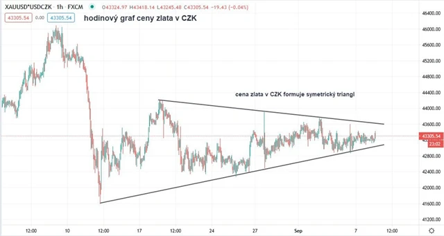 Také cena zlata v českých korunách prošla důkladnou konsolidací poté, kdy 7. srpna dosáhla historického rekordu. Na hodinovém grafu je patrný téměř symetrický trojúhelník, který se zúžil na rozpětí 43 000 až 43 600 Kč za trojskou unci.
