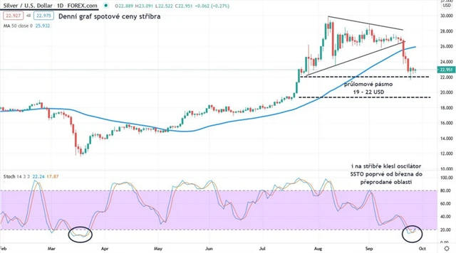 Před týdnem jsem uváděl, že pokud dolarové ceny obou kovů klesnou pod silné výběžky z 12. srpna, hrozí pokles až do původních průlomových oblastí, které byly u stříbra v pásmu 19 až 22 USD za unci a u spotové ceny zlata v pásmu 1 800 až 1 820 USD za unci. Spotová cena stříbra se minulý čtvrtek během asijského obchodování sesunula na 21,66 USD, a tudíž korigovala do horní oblasti uváděného pásma.