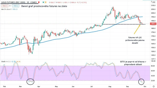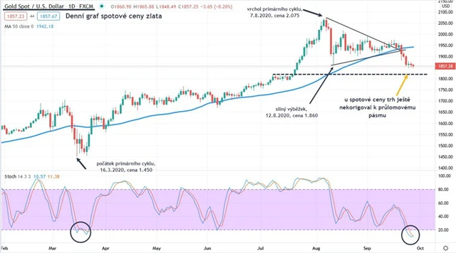 Od vrcholu 2 075 USD ze 7. srpna zlato koriguje níže již 8. týdnem. Tím, že cena propadla pod výběžek 1 860 USD, tvoří trh nejnižší cenu poklesu právě nyní, což může indikovat, že primární dno se dále tvoří, jelikož toto nastává vždy s nejnižší cenou v rámci celého poklesu. Jakmile tento cyklus skončí a začne nový primární cyklus, očekávám návrat ceny nad 50denní průměr a opětovný útok býků na hladinu 2 000 USD za unci.