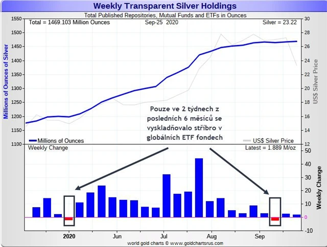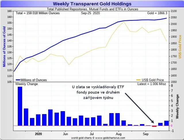 Na trhu s fyzickým kovem se naopak neprodávalo, ale nakupovalo. Globální ETF zaměřené na zlato v posledních 2 týdnech naskladňovaly kov v objemu 0,5 milionu a 1 milionu uncí. Jediným týdnem z posledních 25 týdnů, ve kterém se kov vyskladňoval (prodával), byl druhý zářijový.