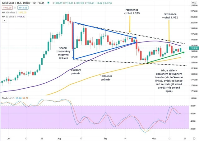 V uplynulém týdnu se trh se zlatem pokusil vyhnat cenu nad 50denní klouzavý průměr, zatím ale neúspěšně. Posledních 15 obchodní dnů se kurz pohybuje v úzkém obchodním pásmu 50 dolarů mezi podporou okolo 1 880 USD a rezistencí v pásmu 1 920 až 1 930 USD za trojskou unci.