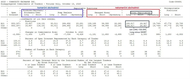 Co se týče současných obchodníků, zdá se, že se jedná o fundamentální spekulanty (investory) s velkými účty, kteří se rozhodli držet zlato dlouhodobě a zatím neopouštět trh při současných cenách. Právě oni jsou momentálně největší skupinou, která stojí proti komerčním obchodníkům (commercials) na SHORT straně.