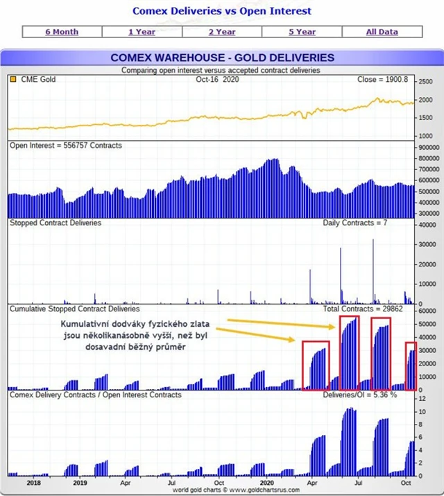 Co se týče burzy COMEX jako takové, na tomto trhu se převážně obchodovaly derivátové kontrakty. V letošním roce však začala enormně narůstat poptávka po fyzickém kovu, a proto se zde vyskladňuje nebývale velké množství fyzického kovu, který je dodáván proti futures. Z grafu je patrné, že v tradičních vypořádacích měsících (duben, červen, srpen a nyní i říjen) bylo vyskladněno vysoce nadprůměrné množství kovu (kumulovaně za uvedené měsíce zhruba 166 tisíc kontraktů, tedy 16,6 milionu uncí).