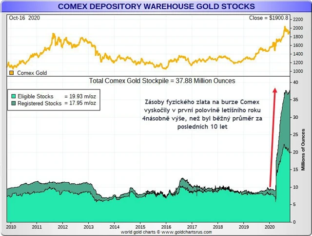 Burza COMEX se poučila z březnového dramatického vývoje, kdy panovaly obavy o dodávky fyzického kovu, a již v dubnu začala razantně navyšovat zásoby zlata, které se v následujících třech měsících zvýšily z 9,5 milionu na aktuálních 37,8 milionu uncí. Necelá polovina z těchto zásob je k dispozici k vypořádání (registered stocks) a zbytek (eligible stocks) tvoří zlato, které je na burze COMEX skladováno a není určeno k vypořádání.