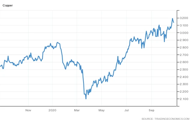 Čínu koronavirus zasáhl jako první, ale díky obrovským úvěrům již dosáhla robustního zotavení (podobně jako po globální finanční krizi v roce 2008). Narušení dodávek způsobené covidem-19, snaha finančních spekulantů najít zajištění proti inflaci a v neposlední řadě i výrazná čínská poptávka, která rychle snižuje hladinu celosvětových zásob, způsobily, že je zatím rok 2020 velice příznivý také pro průmyslové kovy, zejména měď.