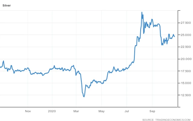 Po roce, kdy zlato posílilo o více než 20 % a stříbro o dvojnásobek, je možná troufalé očekávat další zisky, alespoň v krátkodobém horizontu. Ale kombinace nejnižších možných sazeb, stoupající poptávky po inflačním zajištění a potenciálu oslabení dolaru dává tušit, že se lze těšit na další růst. Zlato podle nás ukončí rok na ceně okolo 2 000 USD za unci, je ovšem složité odhadovat ceny pro rok 2021. Na základě vývoje za posledních deset let lze nicméně pro příští rok očekávat cíl někde mezi 2 400 a 2 500 USD za unci.