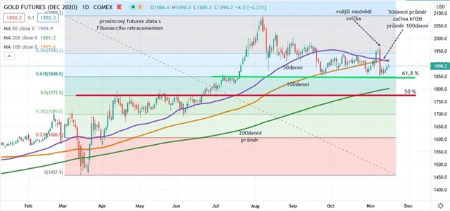 Pokud bychom na prosincový kontrakt na zlato aplikovali Fibonacciho retracement, který měří poslední velký růst ceny (od cenového dna 1 457 USD z poloviny března po vrchol 2 080 USD z poloviny srpna), uvidíme, že cena zlata klesla a zatím se drží nad linií 61,8 %. Propad pod ni by mohl v extrémním případě spustit výprodej až na 50% hladině retracementu na 1 773 USD. Ale silné cenové podpory jsou již na 1 820 USD a dále na 1 800 USD, kde se aktuálně nachází 200denní průměr (spotový trh má mírně odlišné hodnoty).