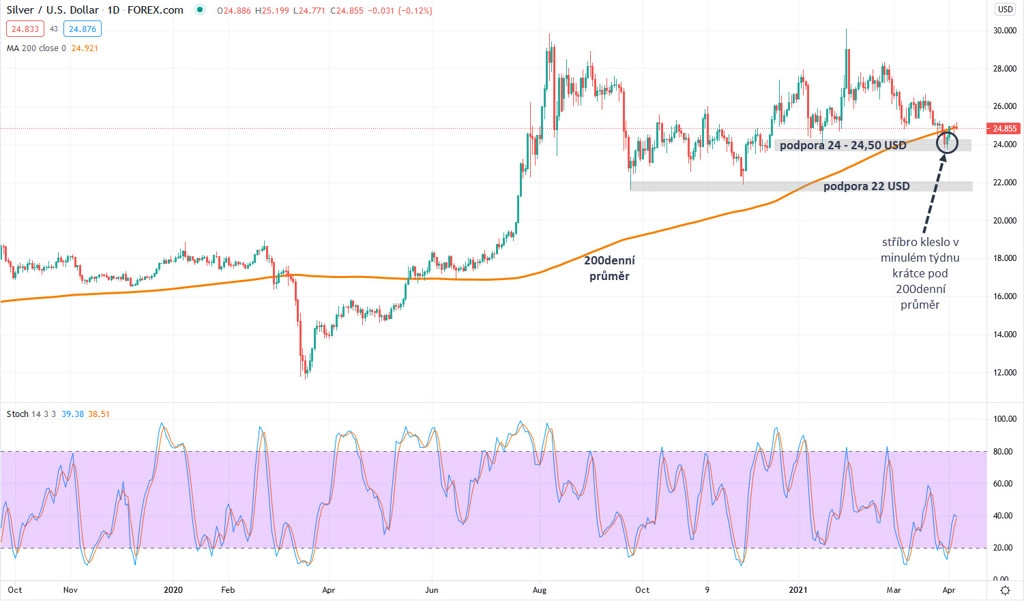 Také stříbro se dokázalo v posledním týdnu vzpamatovat, když jeho cena propadla na dva dny pod 200denní průměr a uzavřela přímo na něm. Nakonec stříbro udrželo podporu v pásmu 24 až 24,50 USD za unci, navíc utvořilo vnitřně tržní býčí divergenci vůči zlatu.