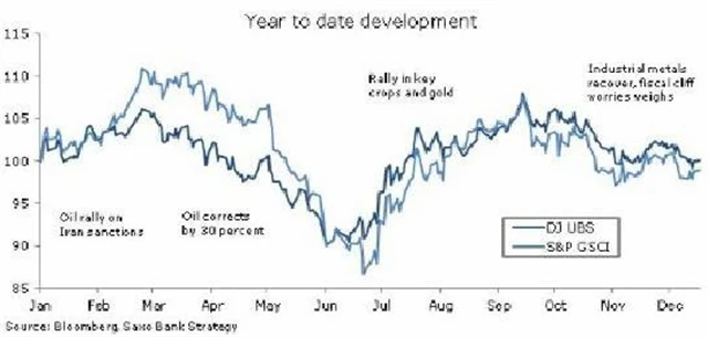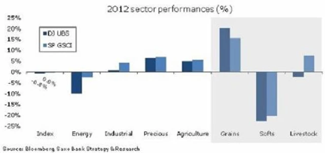 Při pohledu na výkon jednotlivých sektorů podle dvou nejsledovanějších komoditních indexů (Dow Jones UBS Commodity Index a S&P GSCI) zjistíme, že se celkové výnosy v roce 2012 pohybovaly kolem nuly. Když to srovnáme se 14% výnosem akciového indexu S&P 500 a 14,5% výnosem akciového indexu MSCI World, byly na tom letos komoditní indexy bídně.
