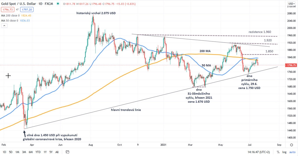 Tyto výběžky tvoří aktuálně nejbližší cenovou podporu. Pokud zlato zlevní pod tuto zónu, je možný opětovný test dlouhodobé trendové linie. Aktuálně se trend nachází okolo 1 760 USD a postupně se zvyšuje o několik dolarů týdně (patrné z denního grafu ceny zlata). Momentální situace působí tak, že stříbro stahuje zlato níže, jelikož cena stříbra klesá k primárnímu dnu. U zlata již primární dno s největší pravděpodobností nastalo 29. června na 1 750 USD za unci.
