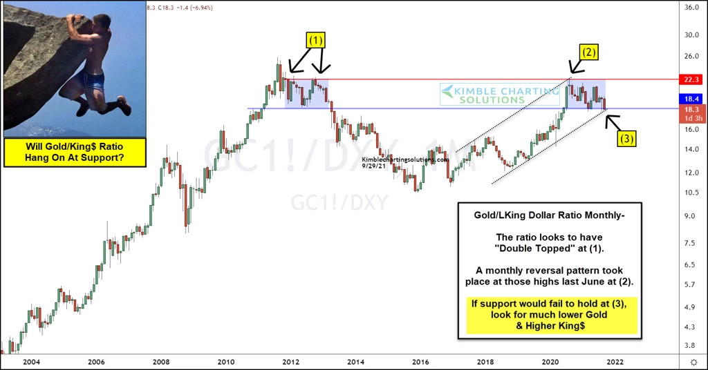 Zlato se dostalo na důležitou křižovatku. Poměr ceny žlutého kovu a dolarového indexu testuje významnou hladinu podpory. Na začátku letošního roku se tento ukazatel dostal k výše položené hladině rezistence, tu ovšem nedokázal ani na třetí pokus prorazit.