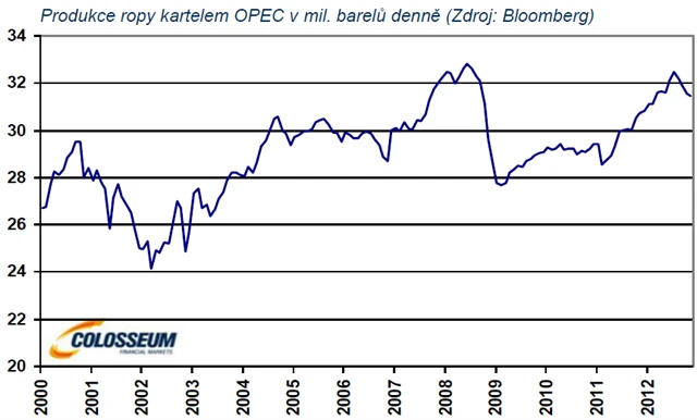 Na straně nabídky ropy registrujeme určité těžkosti. Produkce kartelu OPEC poklesla na téměř jednoleté minimum.